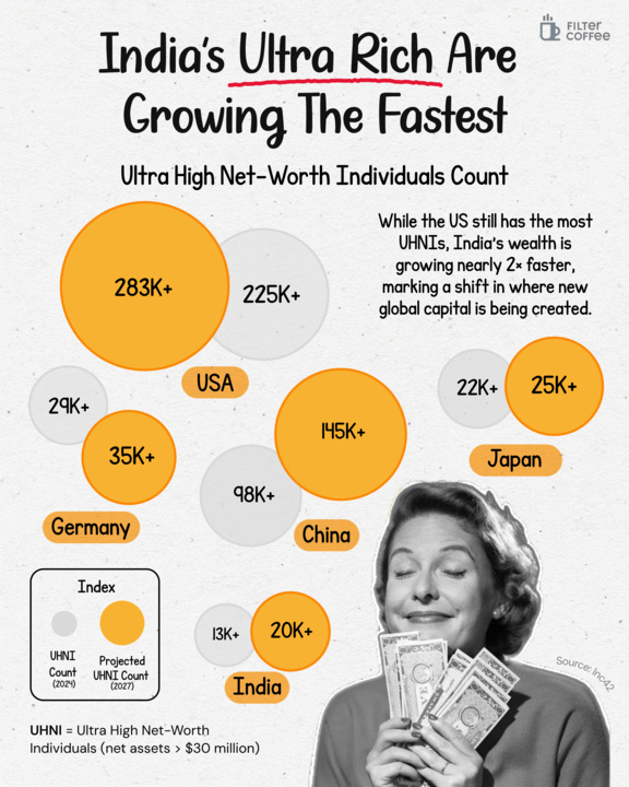 While the US still leads in absolute numbers with over 283,000 UHNIs, India’s wealthy population is expanding at nearly 2x the global pace, signalling a rapid shift in where new wealth is being created.