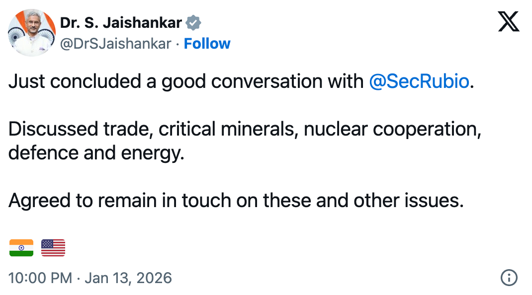 External Affairs Minister S. Jaishankar said his call with U.S. Secretary of State Marco Rubio ended on a positive note.